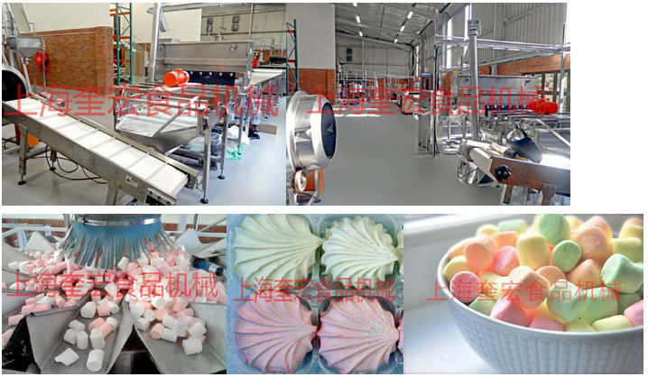 连续式棉花糖生产线可以生产不同形状和颜色的挤出成型棉花糖产品,也可生产果酱夹心的浇注成型棉花糖产品。
